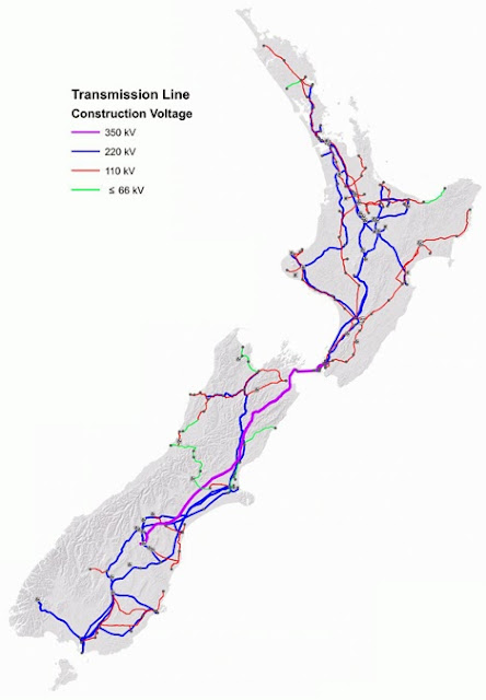 Carte du réseau de transport NZ: 220 kV, 110 kV, 66 kV & 50 kV