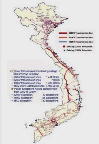 Carte du réseau de transport Vietnamien: ouvrages 100KV, 200KV et 500KVOuvrages 100KV