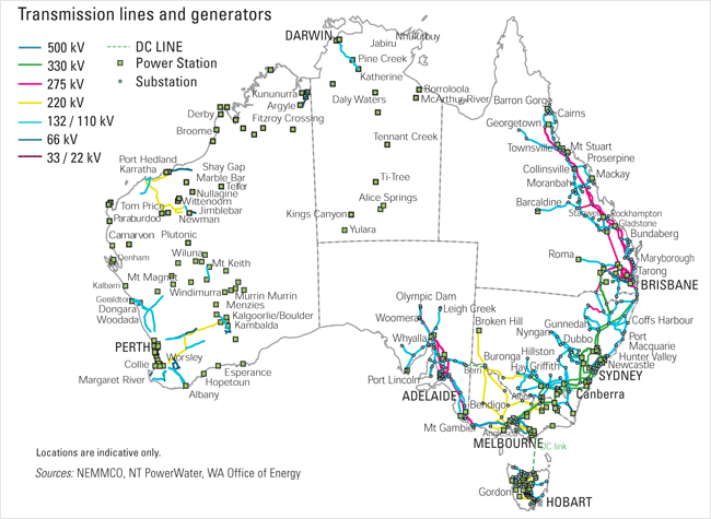 Carte du réseau Australien (500KV, 330KV, 275KV, 220KV, 132/110KV, 66KV)