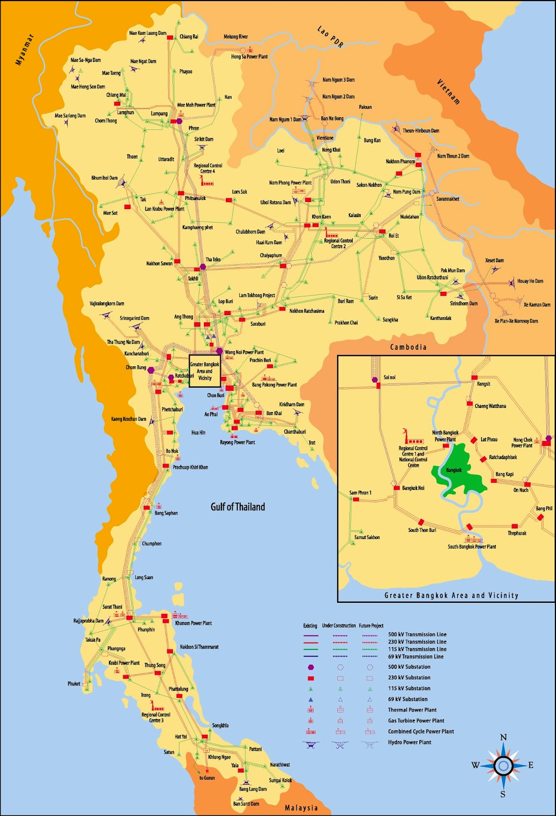 Carte du réseau de transport Thailandais: ouvrages 69KV, 115KV, 230KV et 500KVNord de Bangkok 69KV poteaux bétons